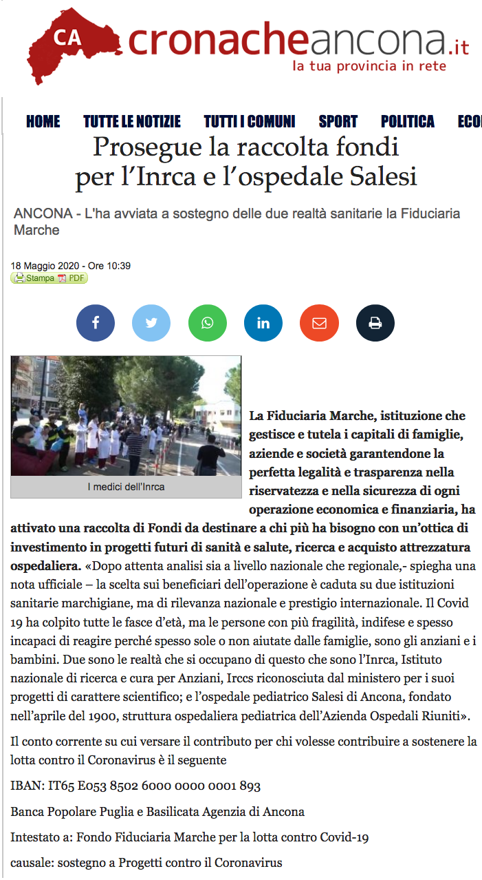 Cronache Ancona – Prosegue la raccolta fondi per l’Inrca e l’ospedale Salesi