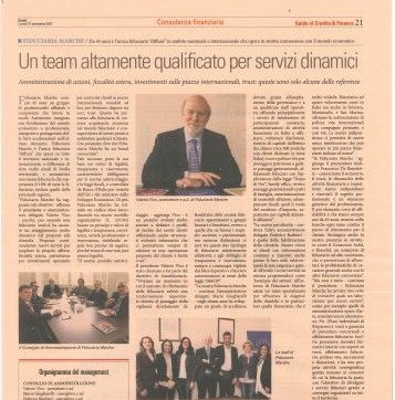 La Fiduciaria Marche propone continuamente nuovi servizi per ampliare la sua offerta (fiscalità estera, piattaforma per investimenti operando per conto dei clienti in piazze internazionali, mandati ad hoc per dirimere dispute tra soci, trust, ecc). Ciò ci ha permesso di crescere acquisendo sicurezza nel mondo fiduciario e consapevolezza di essere pronti a soddisfare qualsiasi richiesta. Ora possiamo dire che la Fiduciaria Marche ha un brand conosciuto”.